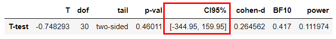 pg.ttest(smoker.Wgt, non_smoker.Wgt) #[-344.95, 159.95]