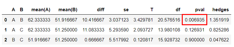 # 결과표에서 A와 B가 비교하는 두 집단이고, pval이 p-value입니다.