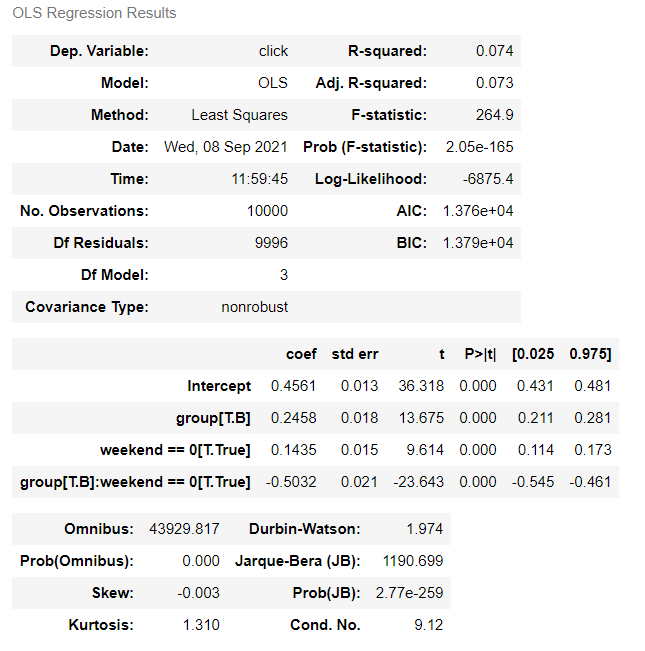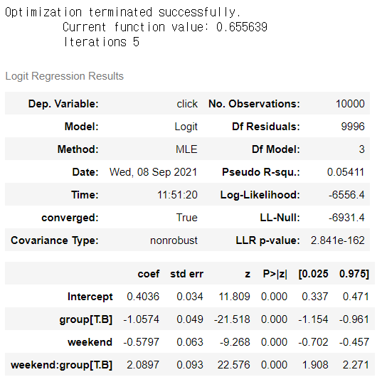 m2 = logit('click ~ weekend + group + weekend:group', df).fit()