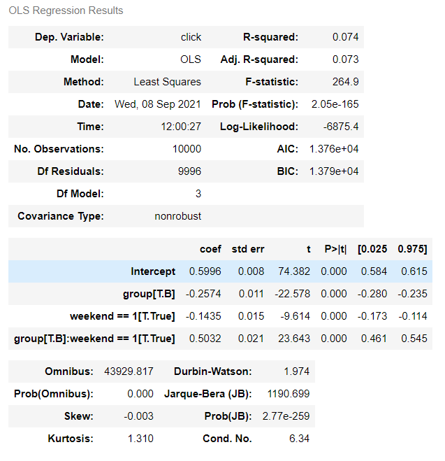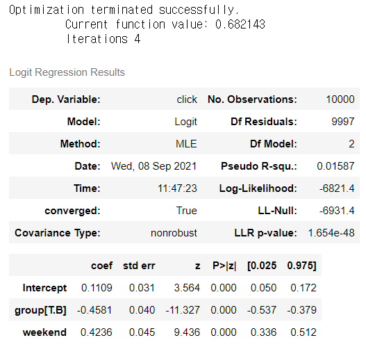 m1 = logit('click ~ weekend + group', df).fit()